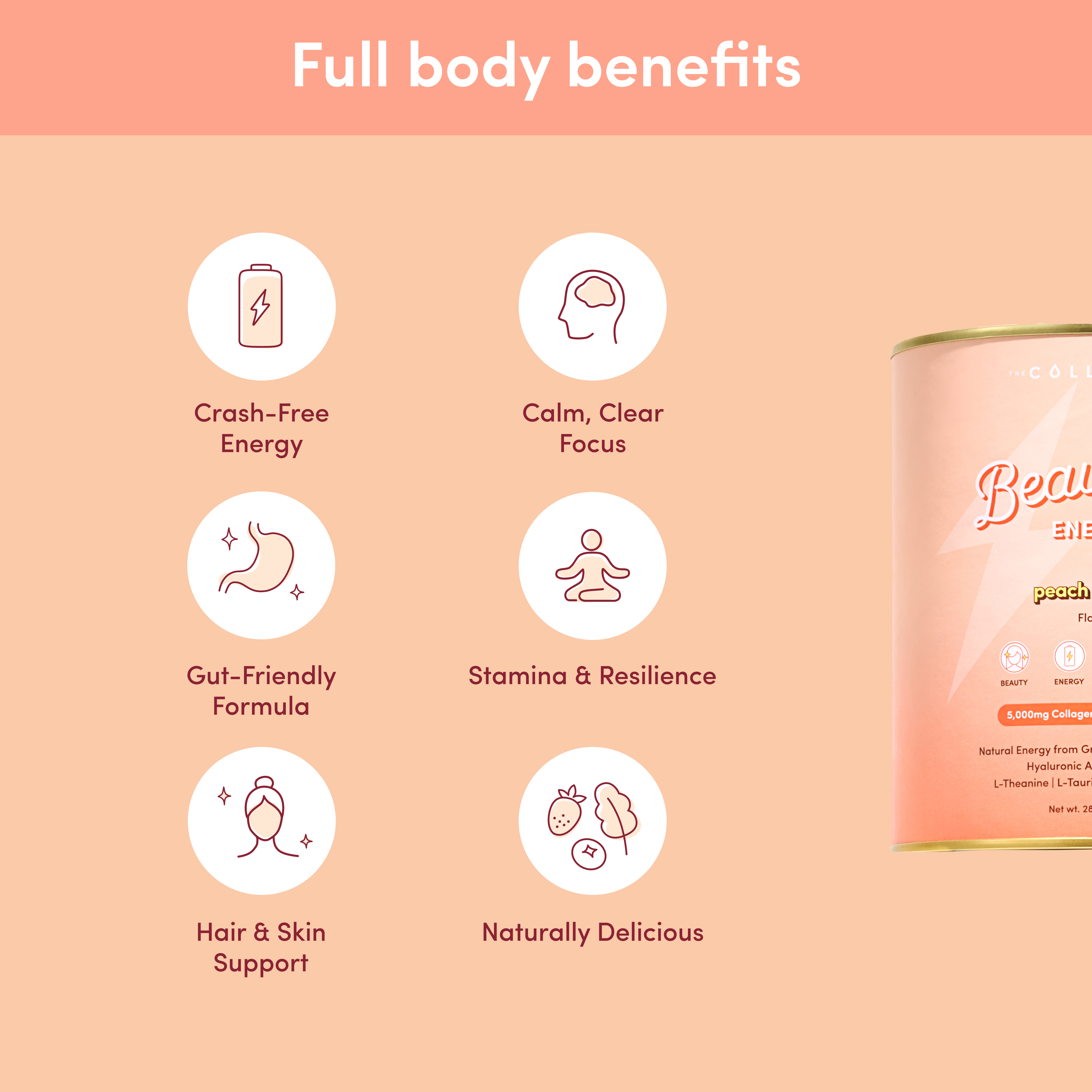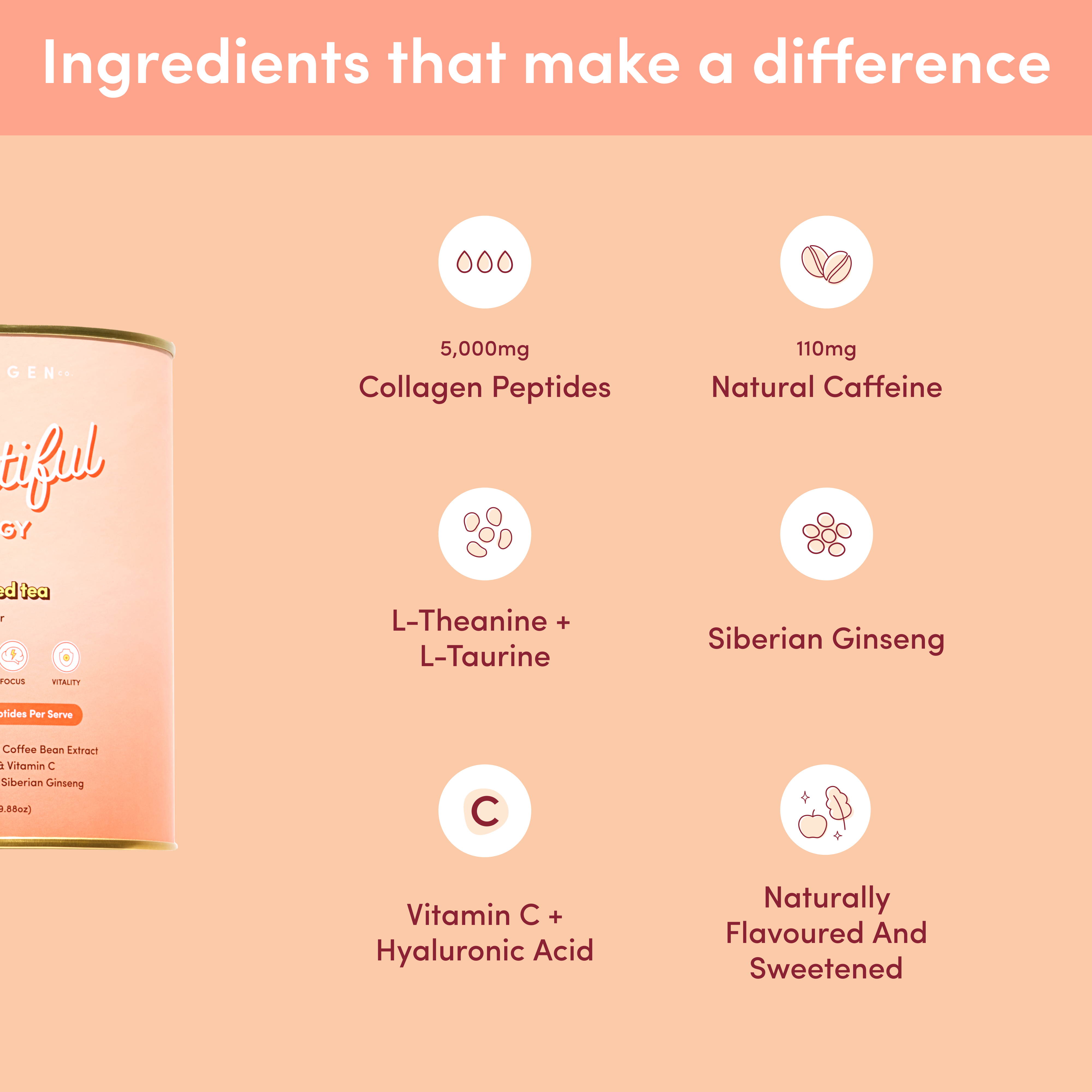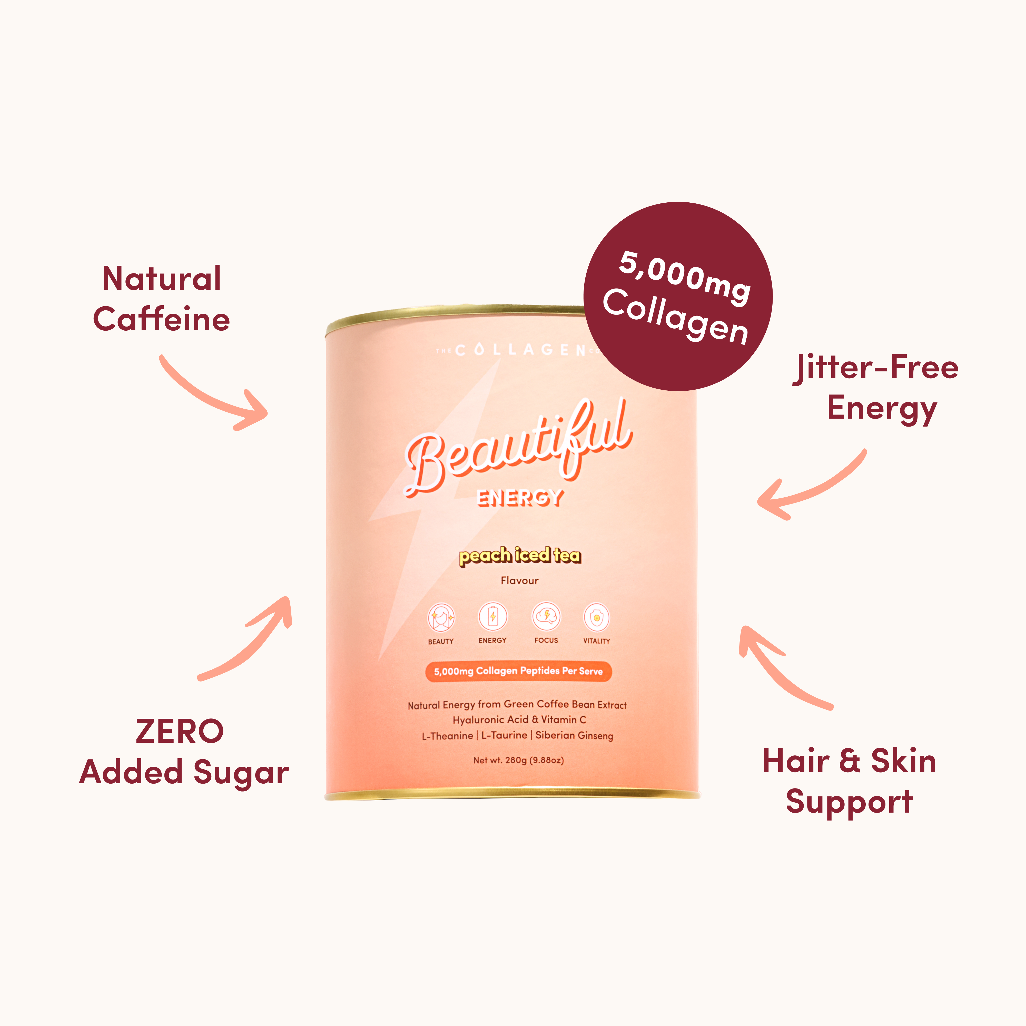 Beautiful Energy is a glow-first energy drink formulated to support focus, skin health, and gut comfort — without the crash, jitters, or artificial junk found in typical energy drinks. It’s powered by clean, natural ingredients like green coffee bean caffeine, hydrolysed collagen peptides, adaptogens, and vitamins to help you feel good and look great.