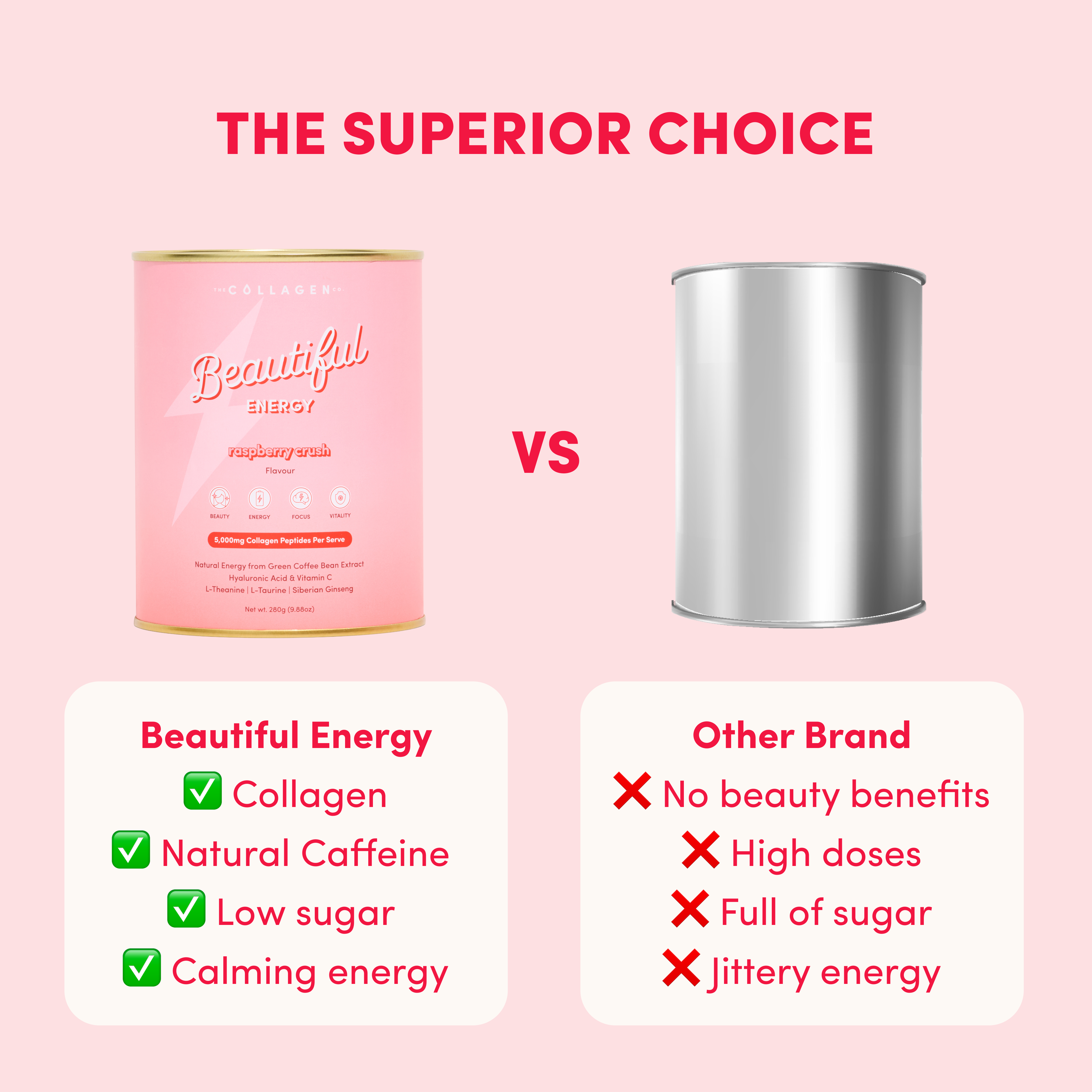 Sharp, tart, and full of bite. Raspberry Crush Beautiful Energy brings a bold berry twist to your daily ritual. Beneath the flavour, a clinically studied blend of Caffeine, Collagen, Adaptogens, and skin- and gut-loving nutrients work to power your day without the crash. From mental clarity to digestion, glow, and mood, this isn’t just another energy drink. It’s your clarity-meets-confidence blend, wrapped in raspberry.