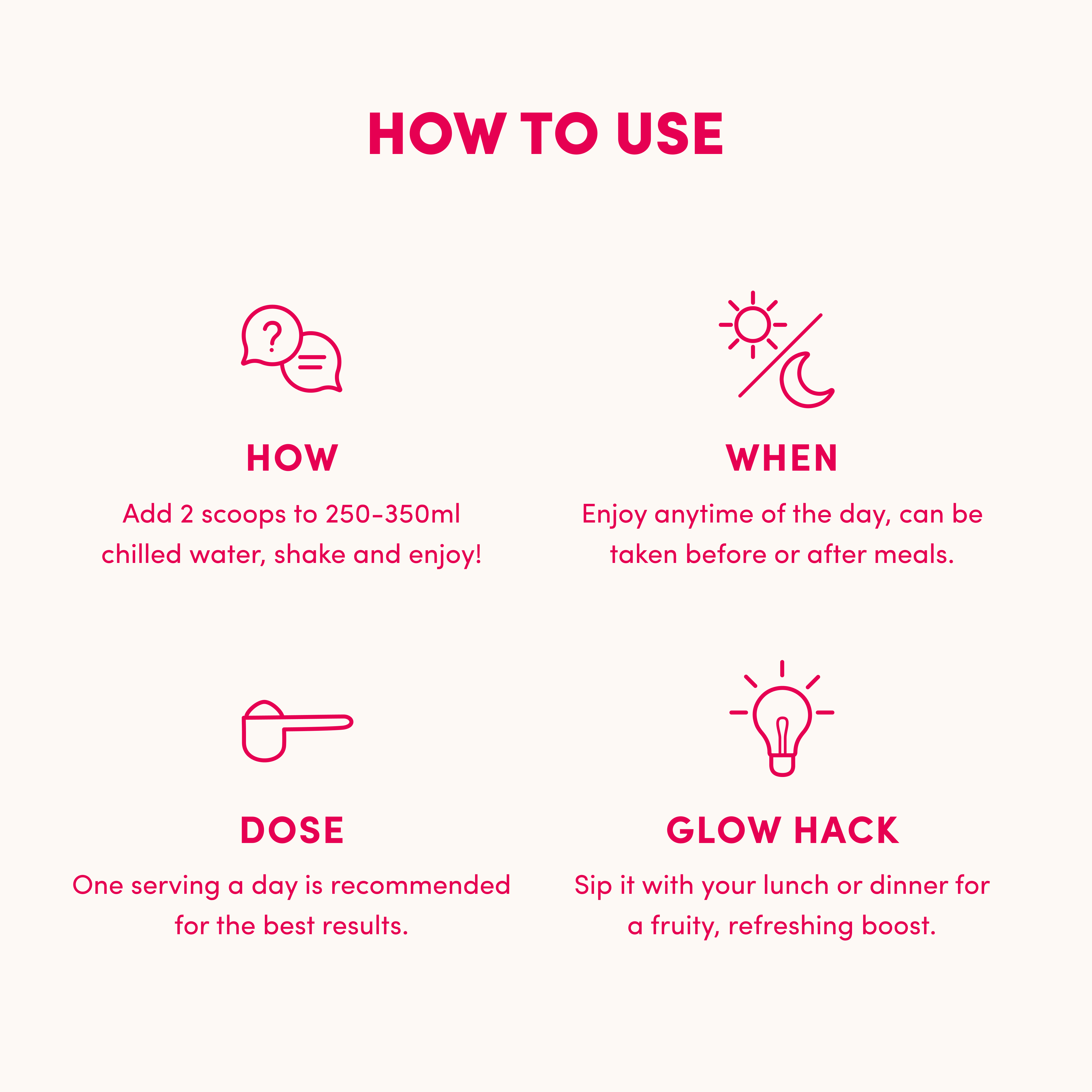 Blend 1 serving (2 scoops) into 250-350ml of water.